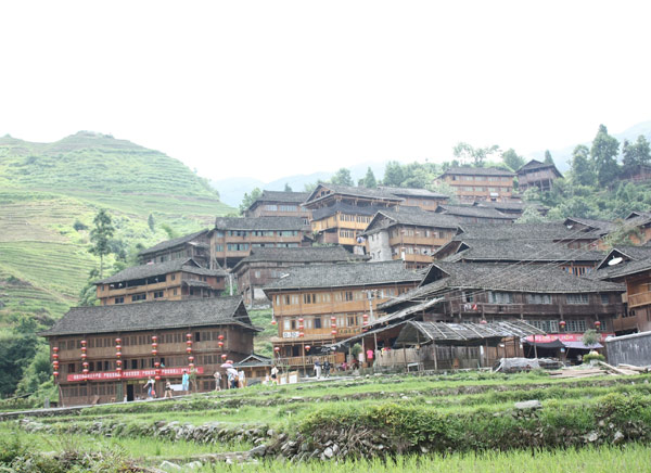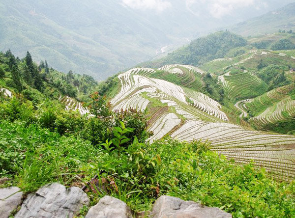 After 2.5 hours' drive from Guilin, we arrive at the foot of the mountain where ancient Longji village lies. The forest-clad steep-sloped mountains came into sight; and beautiful contour-map-like terraced rice paddies are full of water as the green crops grow.