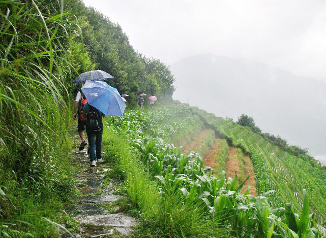At 6:00 am, our long hiking from Ping'an to Dazhai started in the rain. The mists veiled the distant mountains, and rains leave the rice seedling glistening with reflections. A 2.5-hour walks, through the pine and fir woods, up and down on the mountains, along the ridge of the rice fields, led us to a Yao village – Zhongliu village.