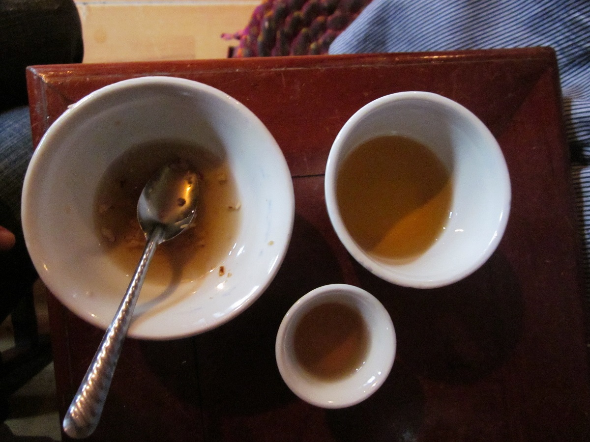 "Sandaocha" is a traditional regional tea ceremony consisting of three unique tea flavors. First bitter, then sweetness, and finally a bitter sweetness (also a bit spicy). A bitter tea represents a hardship in life. A sweet tea stands for happiness while the mixed flavor is for pondering life.