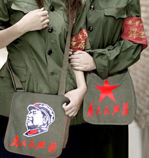 Red Army Cap, or Star Cap has set off a new trend in China. You can match it with a dark green shoulder bag with the famous slogan of“为人民服务”(Serve the People) written on it.