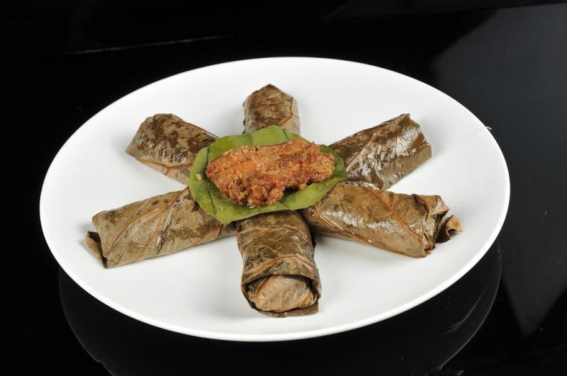 The recipe is similar to that of regular steamed pork, except that fresh lotus leaves, which are famous in Ningbo, are used. The steamed pork is wrapped up and steamed in a steamer, so that the steamed pork not only has the glutinous aroma of steamed pork, but also the fragrance of lotus leaves.