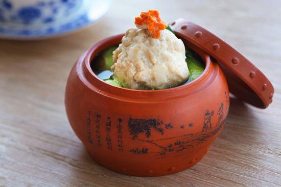 A royal dish from South Song Dynasty, it is made from fresh orange, stuffed with chicken soup and crab meat – good in taste and beautiful in shape.