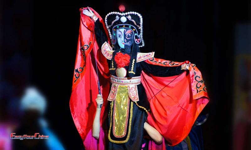 Sichuan opera artists created the special skills to change the facial makeup. What is the face changing secret? In the past, face changing was mainly reply on powder blowing. Red powder means anger, and black powder means fury. Sometimes they used another method- Rubbing Eyes. During the performance, the actor quickly blackened his eyes with the black ink that had been applied to his fingers in advance. Nowadays, full faces are painted on pieces of silk mask, well cut, hung with a silk thread, and then lightly pasted to the face one by one. It’s difficult to see how the masks are changed.