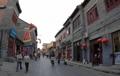 There are two kinds of streets in the Old Town: the business streets and the residential streets. The prosperous ancient business streets are full of small shops standing terraced along both sides. Above each shop there is a silk flag with the name of each business hanging, including restaurants, dress shops, groceries and hardware stores. There are shops selling peony paintings, Tang Dynasty three-color glazed pottery (tang san cai) and plum blossom jade (mei hua yu), which are three of the special products of Luoyang. The residential streets, old and narrow, are filled with small shops and old apartments lining both sides.