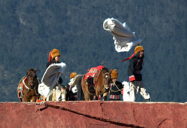 Horses in Yunnan are short leg horses. This kind of horses does not run very fast, but they are very good at handling mountain trails. Only this kind of horse can carry heavy cargo and walk on narrow and steep mountain roads. Therefore, the Naxi people highly respect horses, and horses are one of their worship objects. In the show, the horse caravan runs on the red roof, as if it was a reappearance of "the horse caravan is walking in the mountain with bell ringing” on the Ancient Tea Horse Road six hundred years ago.