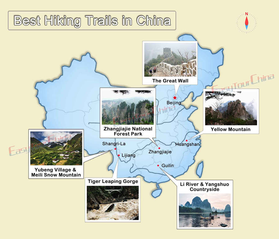 What are the types of trails I will walk and hike in China?