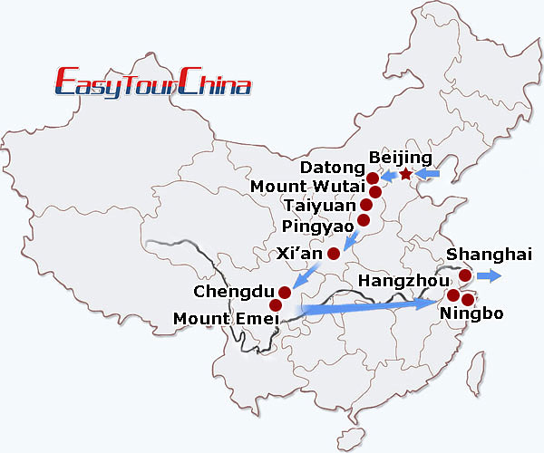Destinations: Beijing - Datong - Wutai Mountain - Taiyuan - Pingyao - Xian - Chengdu - Leshan - Emei Mountain - Chengdu - Hangzhou - Ningbo - Putuoshan - Shanghai
