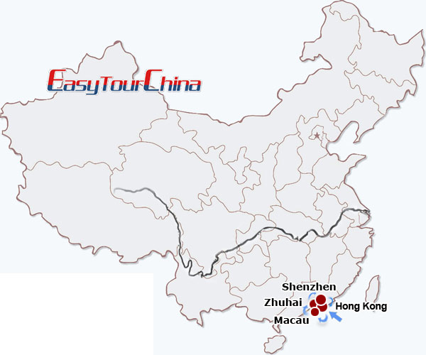 China travel map - Hong Kong+Macau+Zhuhai+Shenzhen Tour In this tour, you will have a delightful break in four coastal metropolis of Guangdong-Hong Kong-Macao Greater Bay Area in South China - Hong Kong and Macau featured with a profound colony background, Zhuhai celebrated for hundred islands, and the bustling commercial city Shenzhen. You will visit popular scenic spots like Aberdeen fishing Village, Stanley Market, Victoria Peak, Meixi Stone Archway Tourist Area, New Yuanming Palace, Shenzhen Safari Park, Splendid China Theme Park, Chinese Folk Culture Village...